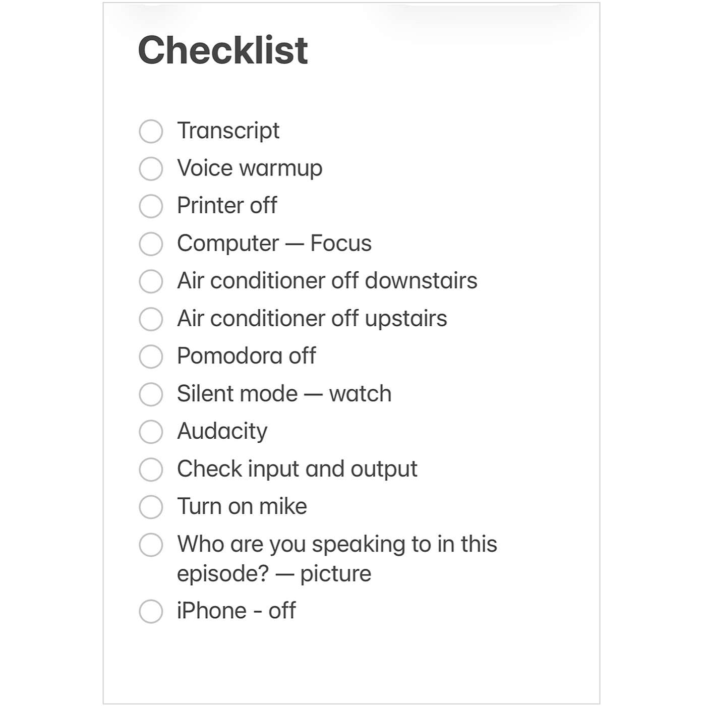 All right. Well, thank you to everyone who sent in your podcast for feedback. I know that that can be a really scary thing. I hope that our feedback was constructive and good, and it helps other people who might be struggling with some of the same issues because we're all in the same boat. Okay, let's get into fan mail. Um, our first message was sent in by Jerry Barber from Gleaning Mustard Seeds. And Jerry sent his recording checklist over in response to our podcasting workflow episode. And Kevin, I wanted to take a note on his checklist, he has printer off. So it goes transcript, voice warm-up, printer off. And I laughed so hard.