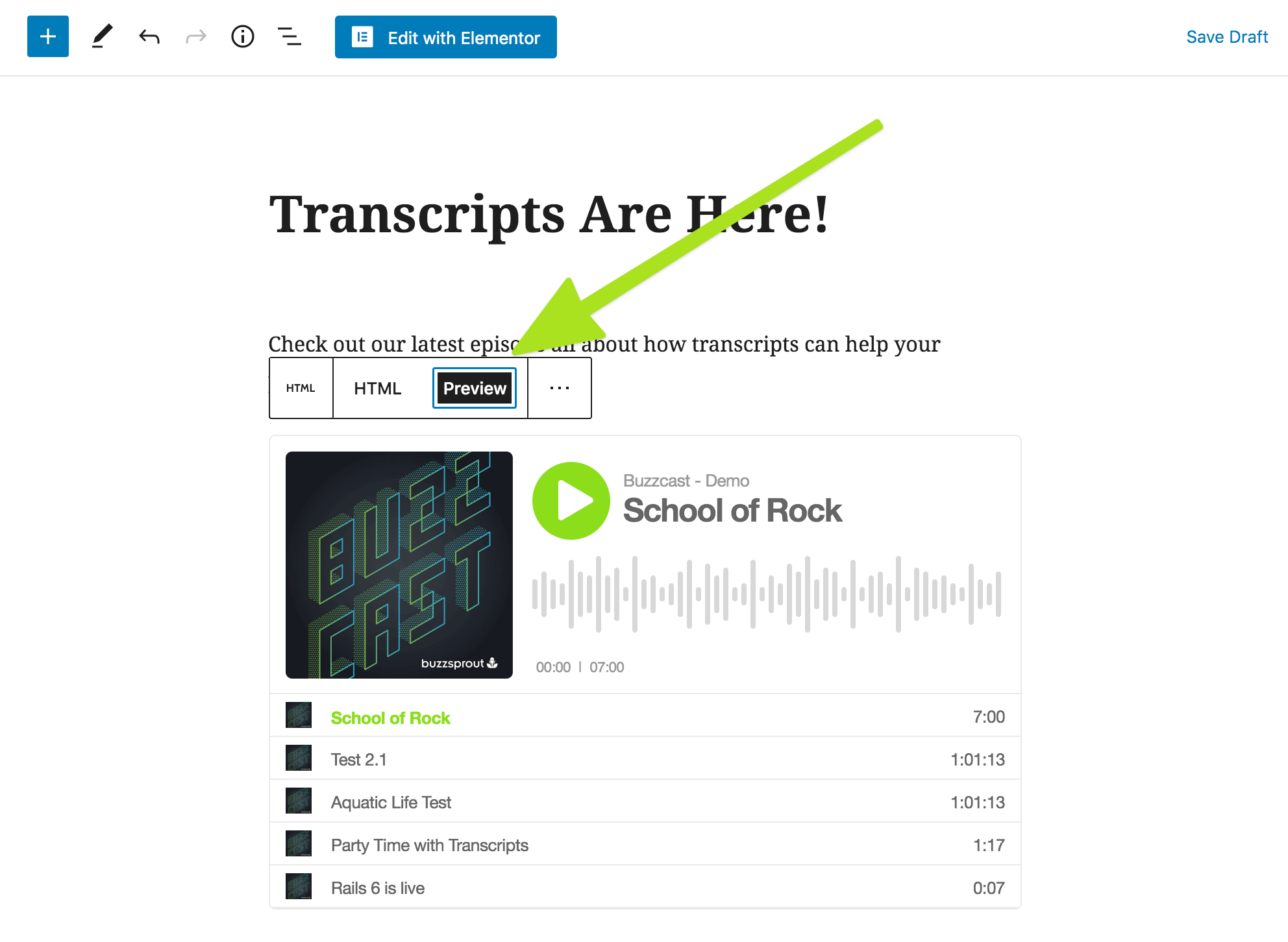 HTML view of the block paste in your Buzzsprout embed code.
