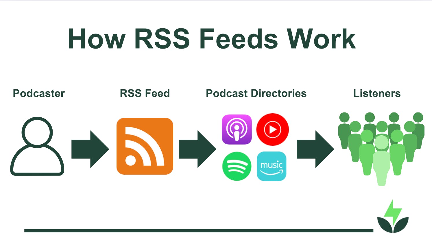 Your RSS feed is essential because podcast directories require it to list your show. Most people find and listen to podcasts using directories like Apple Podcasts (formerly iTunes) and Spotify, which pull your podcast episodes and new content from your RSS feed. Without one, directories can’t list your podcast, and potential listeners won’t be able to find it.