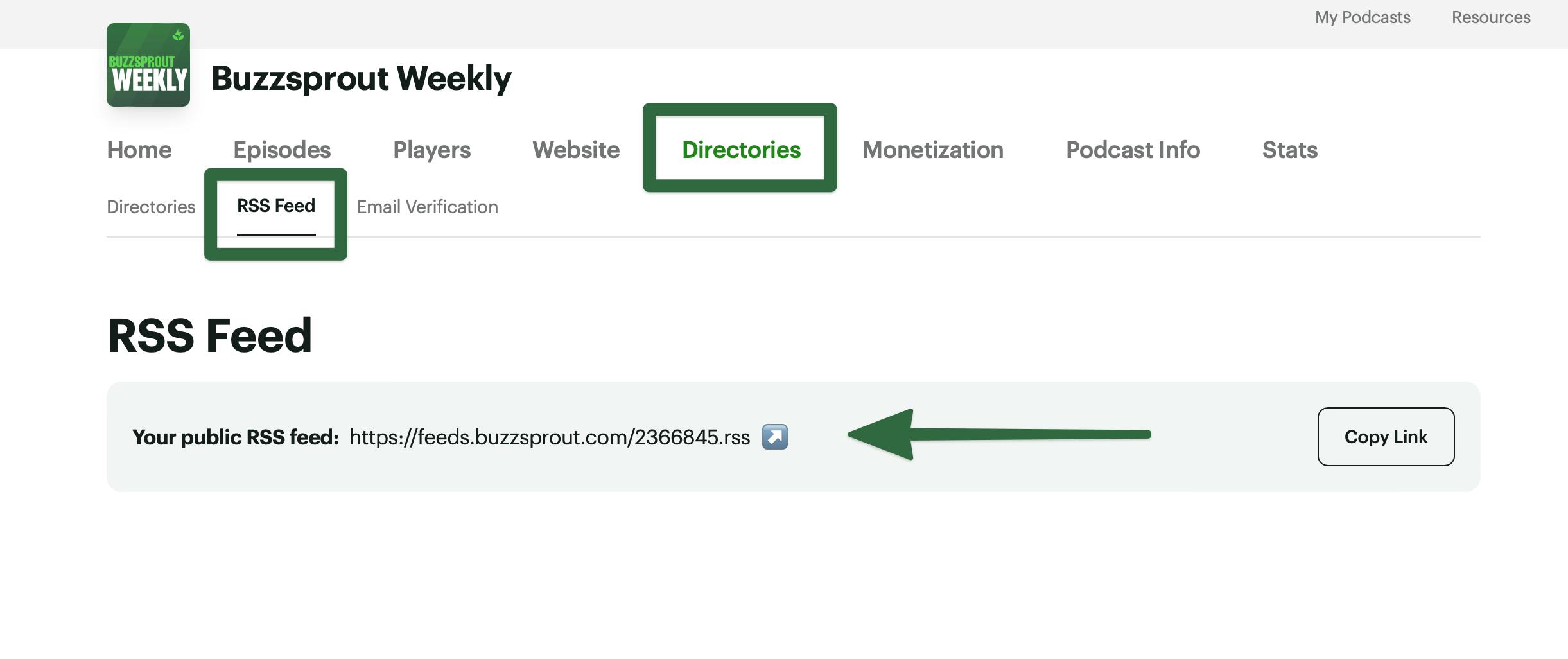 If you’re using Buzzsprout, simply go to the Directories > RSS Feed tab in your dashboard. If you’re with a different hosting platform, check their help guides for instructions on finding your RSS feed URL.