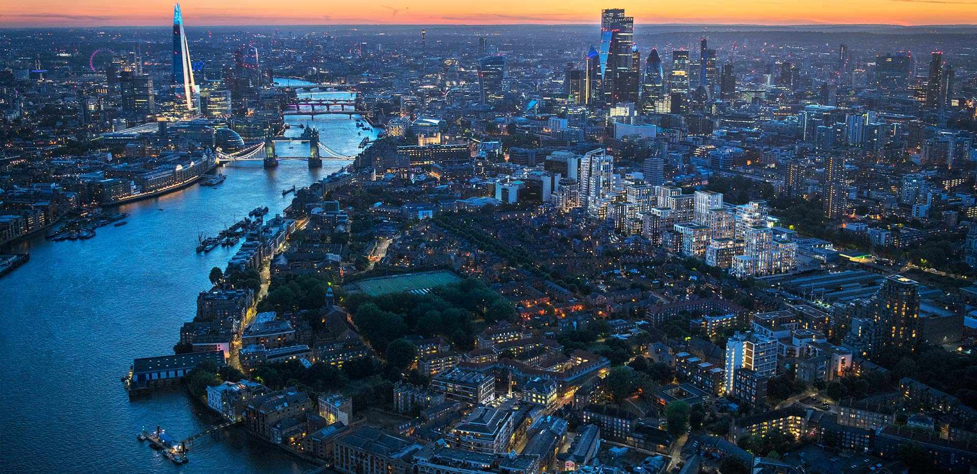 - Panoramic views towards the City of London or Canary Wharf