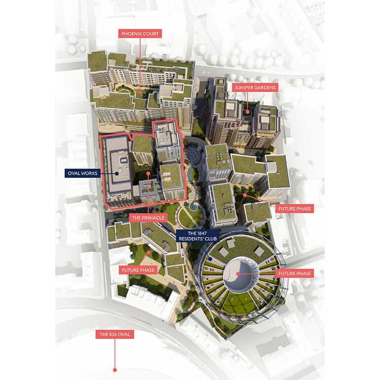 The tallest building at Oval Village, set over 18 floors, The Pinnacle offers unrivalled views over the Kia Oval to the South, the modern edifices of Vauxhall in the West and London’s iconic skyline to the North.